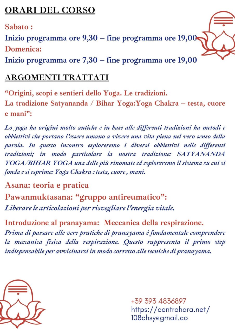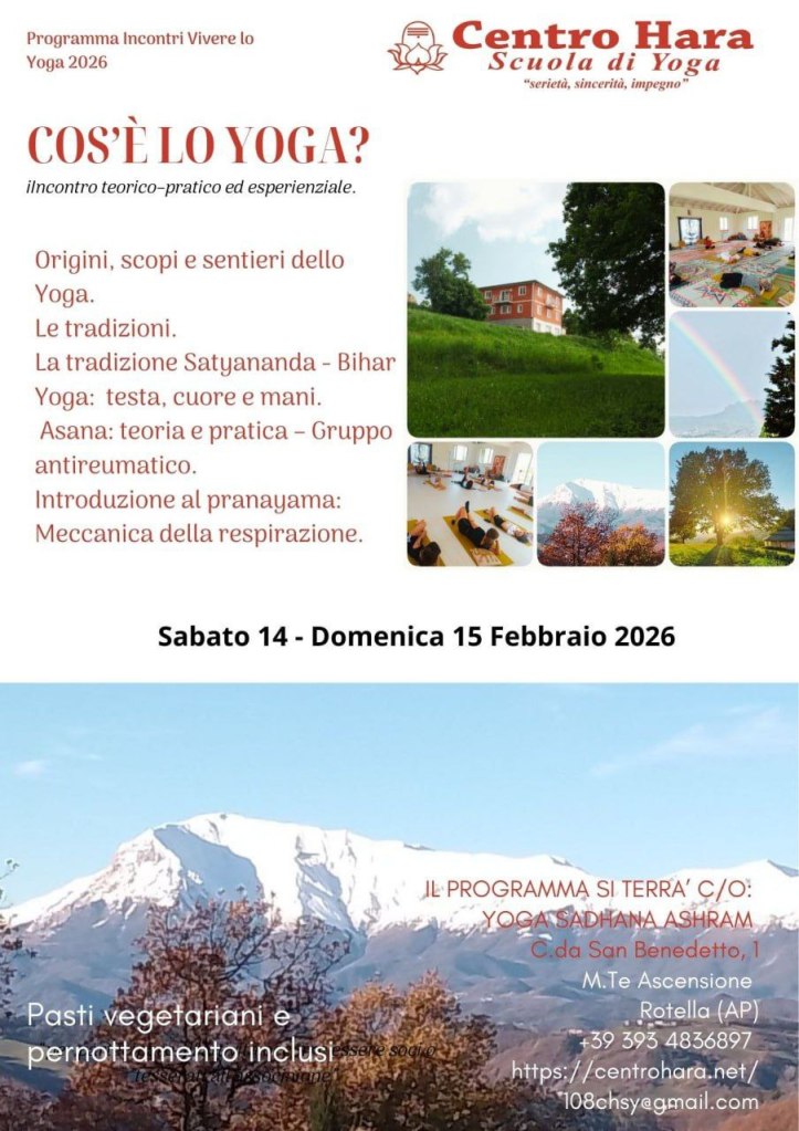 in presenza e ON-LINE Con questa filosofia, il Centro Hara – Scuola di Yoga ASD/PS, (CHSY) associazione con sede legale presso Yoga Sadhana Ashram ai piedi del Monte Ascensione – Rotella (AP), presenta il suo Corso per Conoscere lo Yoga e per Istruttori di Yoga. MissioneL’Associazione si impegna a diffondere lo Yoga nelle comunità con…